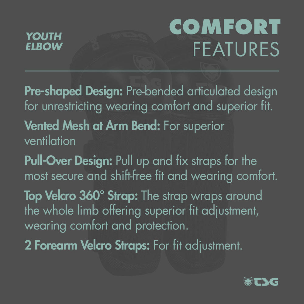Durable TSG elbow pads deliver confidence and comfort to young athletes. It’s easy to adjust the fit for your child’s size, using the adjustable velcro straps. Elbow pads have a top high-end 360° velcro strap and two forearm velcro strap for a comfortable fit. Vented mesh at arm bend keeps your elbow cool for long, pleasurable rides.