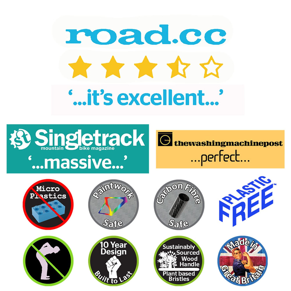 - A claw brush, spoke brush, frame brush, tyre brush and drive chain brush in one
