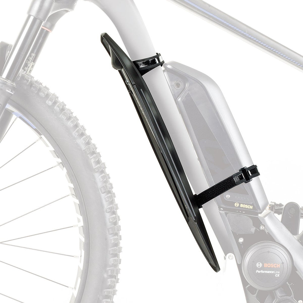 It is attached using two straps on the lower bar, so fat bikes and bicycles with oversized tyres in particular can rest assured of absolute all-around mud protection. It also protects E-MTB batteries from dirt, splashes and flying rocks.