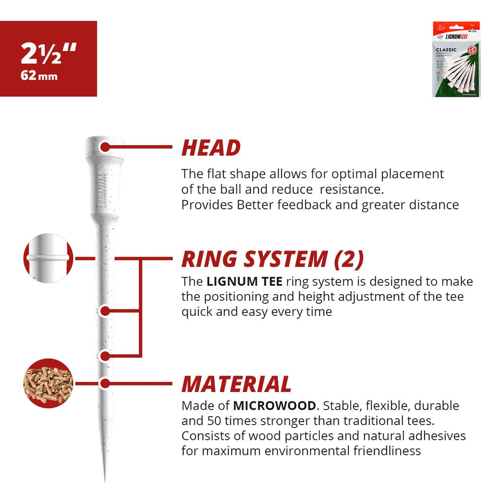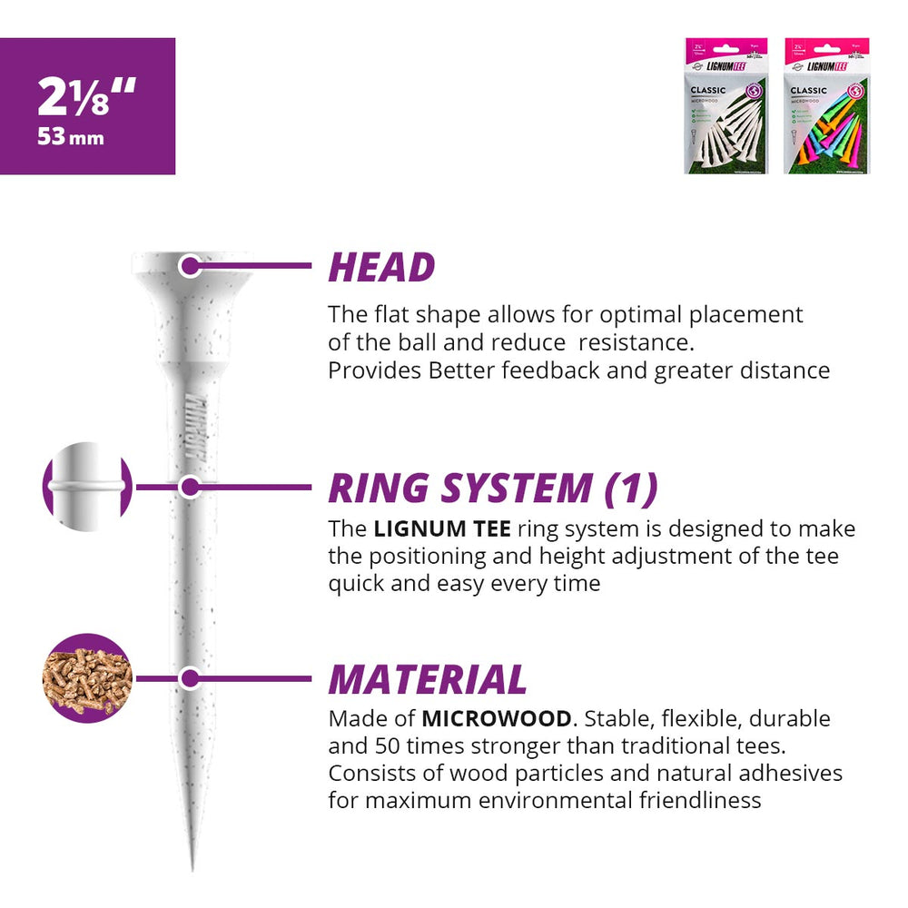 - FLEXIBLE, DURABLE & STURDY: Lignum's microwood construction is 50x more durable than traditional tees, offering the benefits of durability and stability so that golfers can keep using them for a long time. Lignum's construction uses the right amount of polymer fiber for flexibility that increases speed of the ball significantly compared to traditional wood or plastic tees.