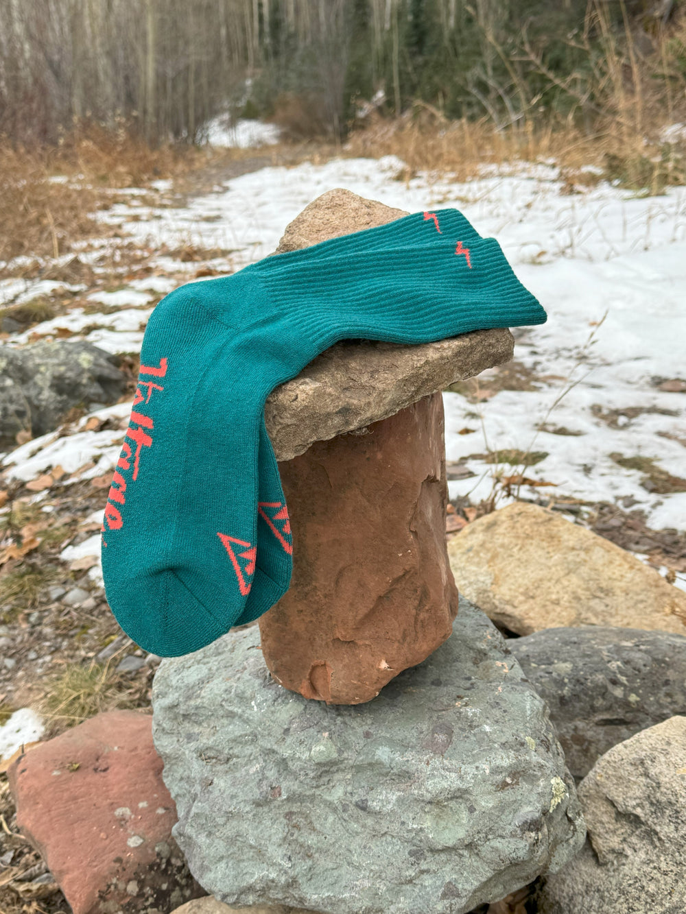 This Magic "Merino" Sock beautifully captures the blue/green hue of our favorite coniferous tree - the Blue Spruce. Colorado schoolchildren voted on Arbor Day in 1892 to name the blue spruce as the state tree. So we propose these be the state sock. Eitherway, the kids know best... we vote you try a pair. Blue Spruce not only adapts to diverse terrains but also transitions seamlessly from the great outdoors to your living room, making them the ideal socks for a nature-loving couch potato. A special blend of merino ensures your feet are snug and ready for whatever outdoor marathon (or TV marathon) comes your way.