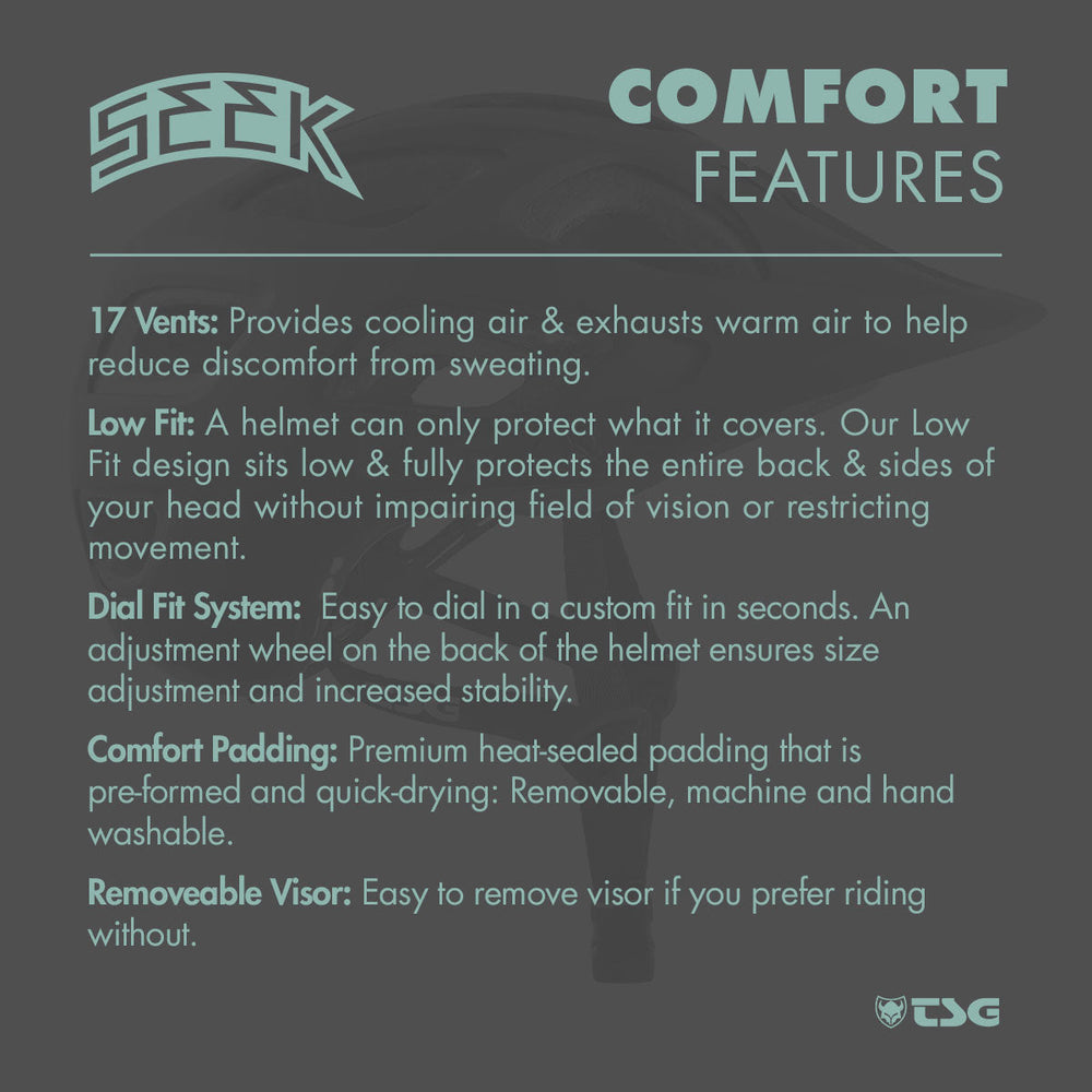 Worry stops with Seek helmets, with the guaranteed quality that is regulated by international safety standards such as CE EN 1078 (European standard for bike and skateboarding helmets) and CPSC (US-American standard for bike helmets). Designed in Switzerland, all TSG products are tested by an internal team of passionate riders.