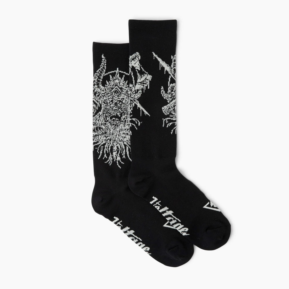 The Viking Sno* Sock — what could be more powerful to wear while bombing down slopes of powder and trekking up mountains on your split skis? We'll let you try to think of an answer. This is a light weight Sno* Sock that keeps your feet warm, while letting them breathe. The viking design is drawn by our good friend Tom Bunney, and makes your calves just THAT much more intimidating on the mountain!!!