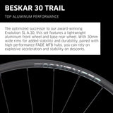 A lightweight aluminum wheel without compromises at a fair price that you can rely on in any situation: The Beskar 30 Trail is the optimized successor to our test-winning Evolution SL A.30 wheel. The lightweight aluminium set for trail bikes consists of the Beskar 30 Light front wheel and the Beskar 30 Base at the rear. For added stability and durability, we have made the 30 millimeter wide rims even more robust and installed our proven, high-performance FADE MTB hubs. Despite outstanding dent resistance, the weight remains low and the acceleration explosive. At the same time, the more stable rear wheel gives you a lot of confidence on descents.