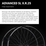 During exploration journeys or long distance trips there are three especially important points regarding your gravel bike: Durability, comfort and efficiency. Our Advanced SL X.R.25 combines these attributes perfectly. Using our flared hookless rim flanges which are proven in the mountain bike world and pairing them with a shallow, very forgiving rim profile, makes for one of the lightest gravel wheelsets in the market. The 25mm inner width rims allow for low pressures which add even more comfort as well as low offroad rolling resistance and high grip on top.