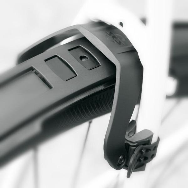 The VELOFLEXX bridge allows the rear mudguard to be attached at the top of the seat stay without tools using rubber straps. That’s why this way of mounting doesn’t rely on the cross stay anymore where the caliper brake is usually bolted. At the front, the VELOFLEXX is mounted to the fork bridge with a rubberized hook and loop fastener or a cable tie. The frame adapters enable it to be mounted to any fork the can the angle be adjusted. The black-coated stays provide even greater support.